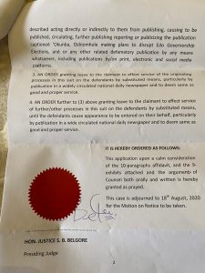Quoting from the court ruling, Ajayi said the court granted, among others, orders “restraining the Edo State Government, whether acting through the first defendant and or 2nd defendant, its agents, representatives, officers, servants, proxies, assigns, trustees or any other person howsoever described, acting directly or indirectly for the Edo State Government, from publishing, causing to be published, circulating, further publishing, reporting or publicising the publication captioned ‘Okunbo, Oshiomhole making plans to disrupt Edo Governorship Elections,’ and or any other related defamatory publication by any means whatsoever, including publications by/on print, electronic and social media platforms.”