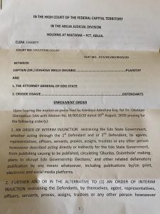 An Abuja High Court, presided over by Justice Suleiman Belgore, has granted orders of injunction restraining the Edo State Government and its officers from making further defamatory publications about business mogul, Captain Idahosa Wells Okunbo (popularly known as Capt. Hosa).