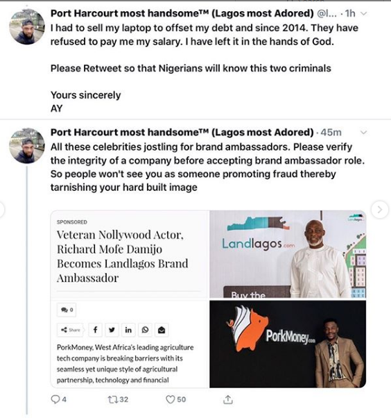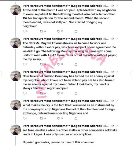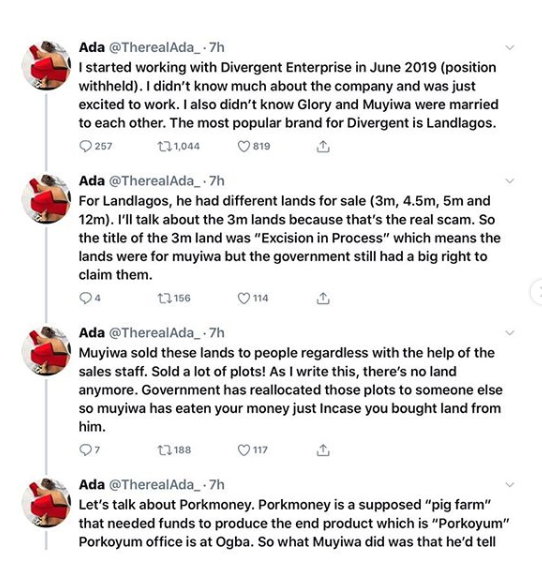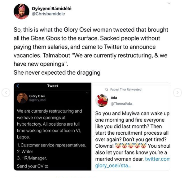 Several former employees of Glory and Muyiwa (who are said to be silently married) have taken to Twitter to call them out for alleged fraud, manipulation and slavery.
