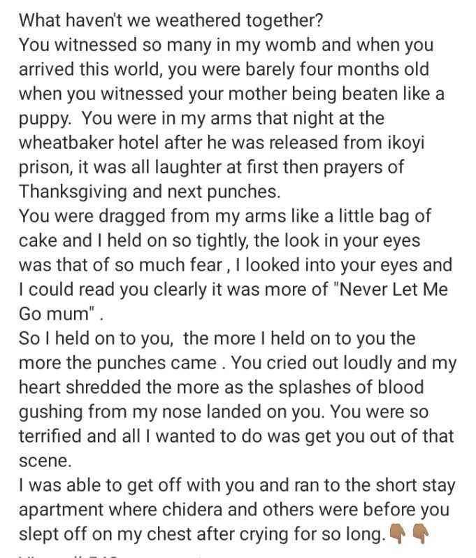 Precious claimed the beating caused blood to stream from her nose, and her kid wept as he saw his father, who had recently been freed from Ikoyi prison, hit her.