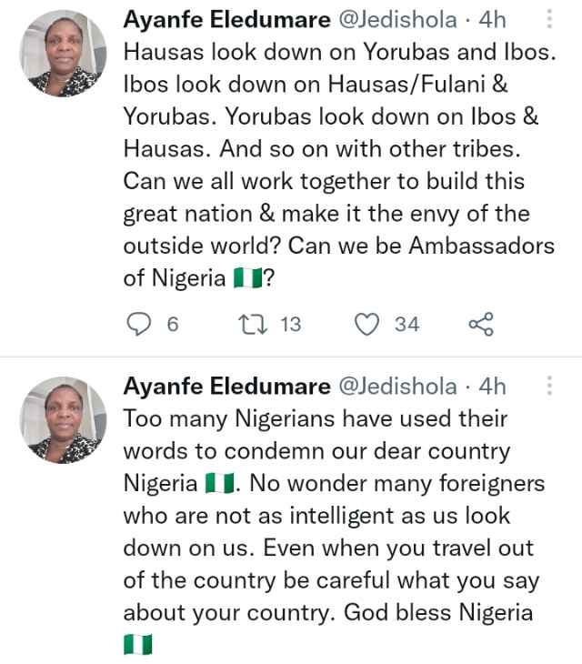 “Too many Nigerians have used their words to condemn our dear country Nigeria Flag of Nigeria. No wonder many foreigners who are not as intelligent as us look down on us. Even when you travel out of the country be careful what you say about your country. God bless Nigeria.