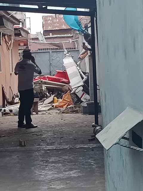 It was gathered that the copter dropped from the sky around 12 noon and crashed into a residential building on Salvation Road in the Opebi area.