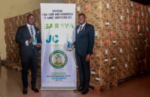 The hand sanitizers were presented by the JCI Nigeria President in the presence of the 2016 JCI World President, JCI Senator Paschal Dike and 2019 JCI Nigeria President. JCI Senator Adetola Akinola (who both represented Saraya Worldwide) to the State Governor in the company of the State Commissioner for Health, Prof. Augustine Vincent at the State Government House.