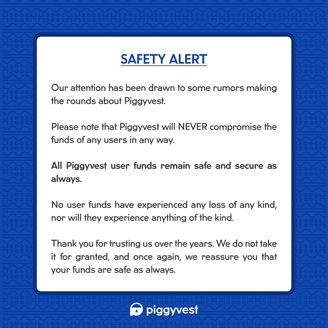 “Please note that Piggyvest will NEVER compromise the funds of any users in any way. All Piggyvest user funds remain safe and secure. No user funds have experienced any loss of any kind, nor will they experience anything of the kind,” the statement reads in part.