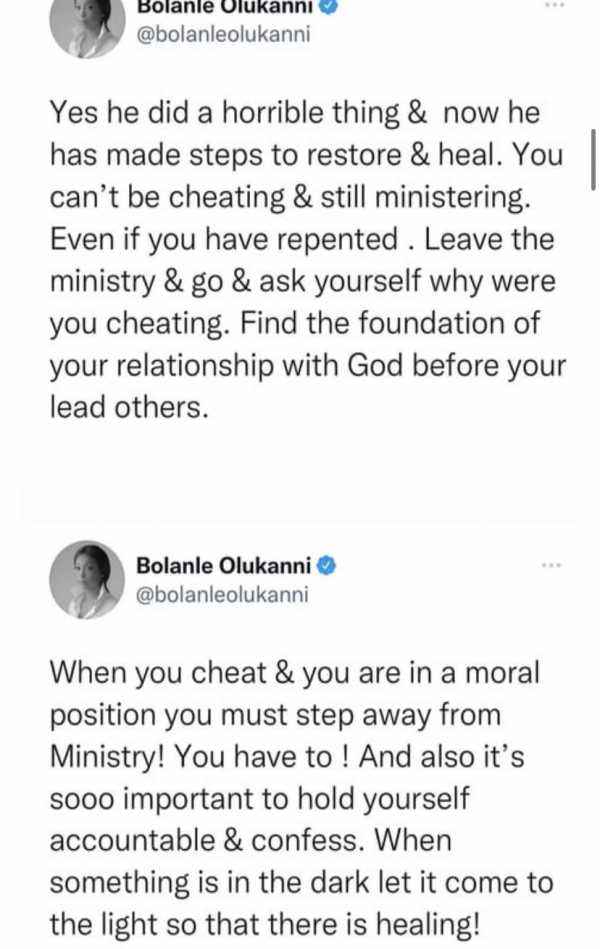 Reacting to the news on social media, Bolanle wrote; “Yes he did a horrible thing and now he has made steps to restore and heal. You can’t be cheating and still ministering. Even if you have repented. Leave the ministry and go and ask youself why you were cheating. Find the foundation of your relationship with God before you lead others,”