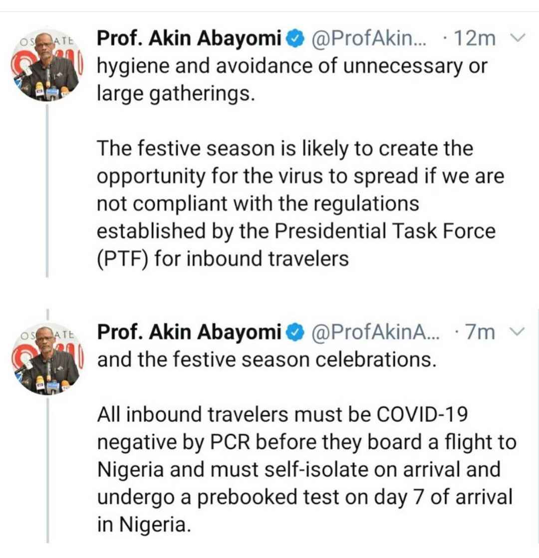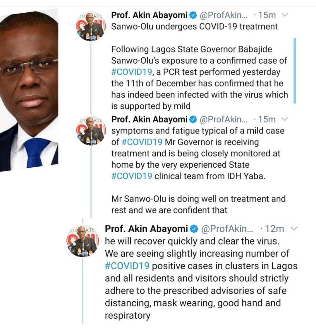 “A PCR test performed yesterday the 11th of December has confirmed that he has indeed been infected with the virus,” Lagos State commissioner for information Gbenga Omotoso said.
