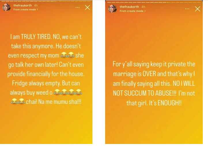 I am TRULY TIRED. NO, we can’t take this anymore. He doesn’t even respect my mum. She go talk her own later! Can’t even provide financially for the house. Fridge always empty. But can always buy weed o. Chai!! Na me mumu Sha!!! For y’all saying keep it private the marriage is OVER and that’s why I am finally saying all this. NO I’LL NOT SUCCUM TO ABUSE!! I’m not that girl. It’s ENOUGH!!