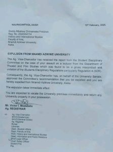 Modebelu confirmed that the student was found guilty of gross misconduct and a violation of the institution’s Student Disciplinary Regulations, particularly Regulation 4. “The Ag. Vice-Chancellor, consequently, on behalf of the University Senate, approved the Committee’s recommendation that you be expelled, and you are hereby expelled from Nnamdi Azikiwe University, Awka,” the statement read.