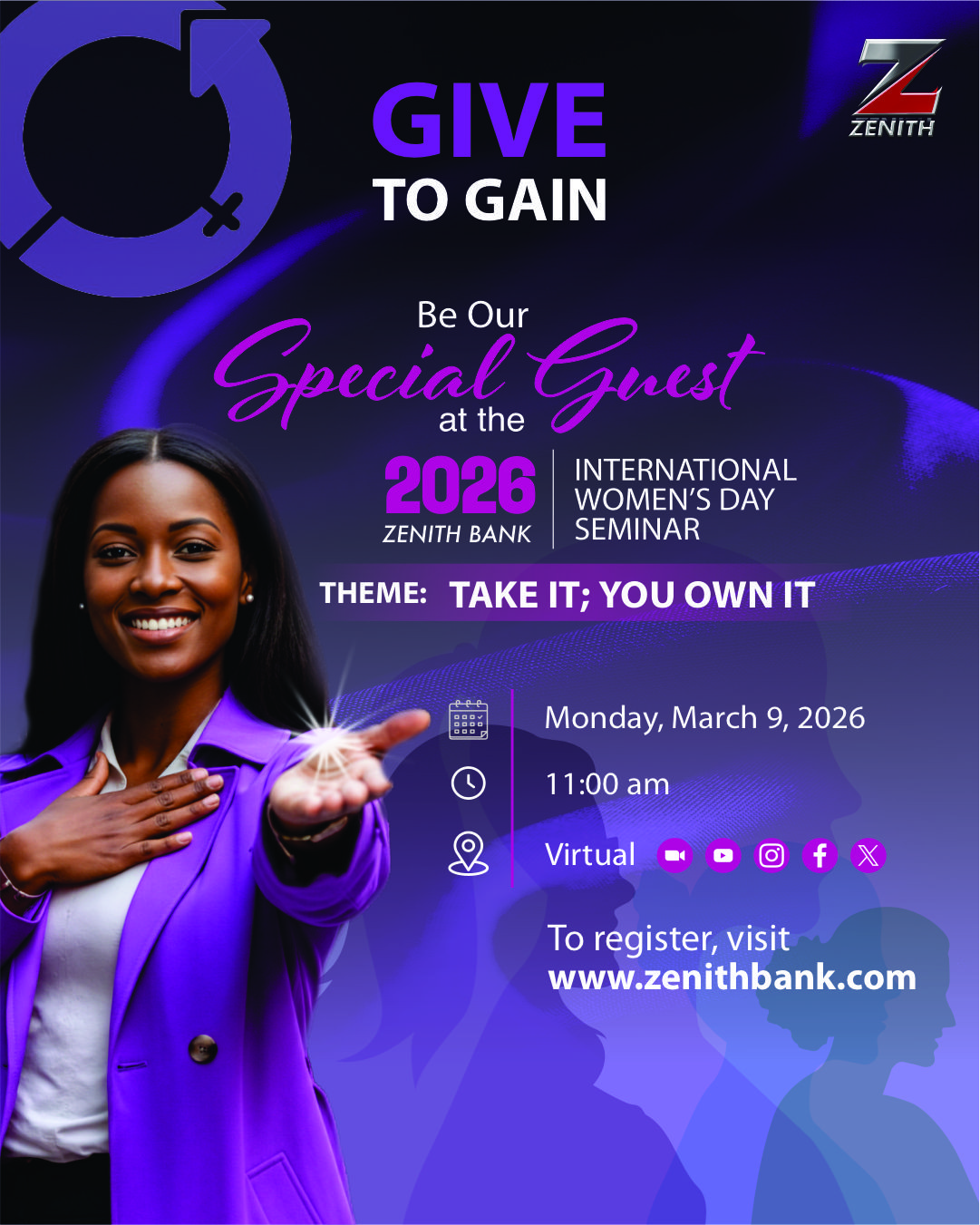 Aligned with the global theme ‘Give to Gain” which underscores the principle that sustainable progress is achieved when individuals and institutions invest intentionally in women, Zenith Bank’s 2026 IWD seminar is themed “Take It, You Own It.” The theme reflects the Bank’s belief that while institutions must give through enabling environments and equitable systems, women must also step forward to claim space, own their value, and lead with confidence. It is both an affirmation and a challenge: embrace opportunity, empower yourself and others, and take ownership of your growth journey.
